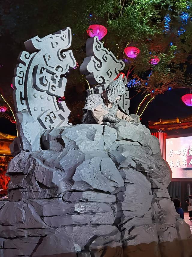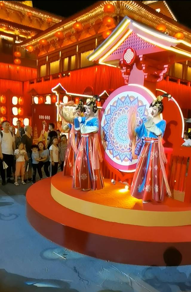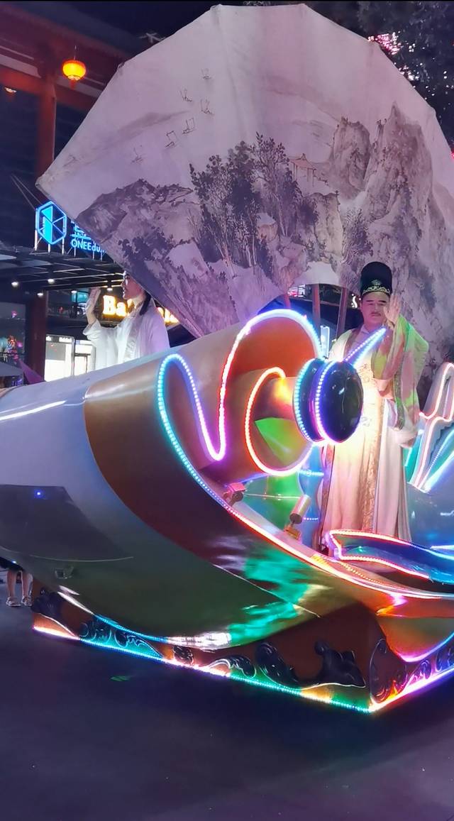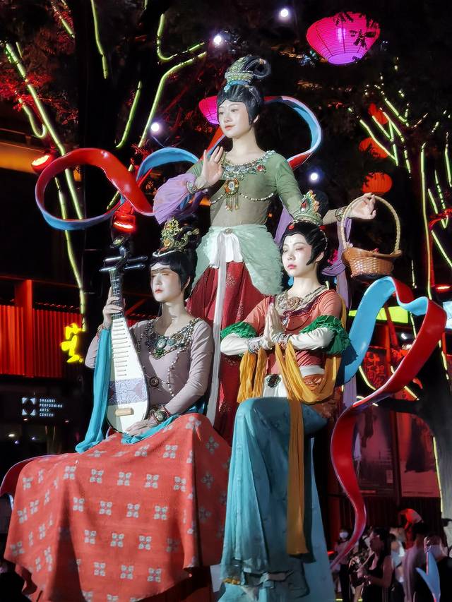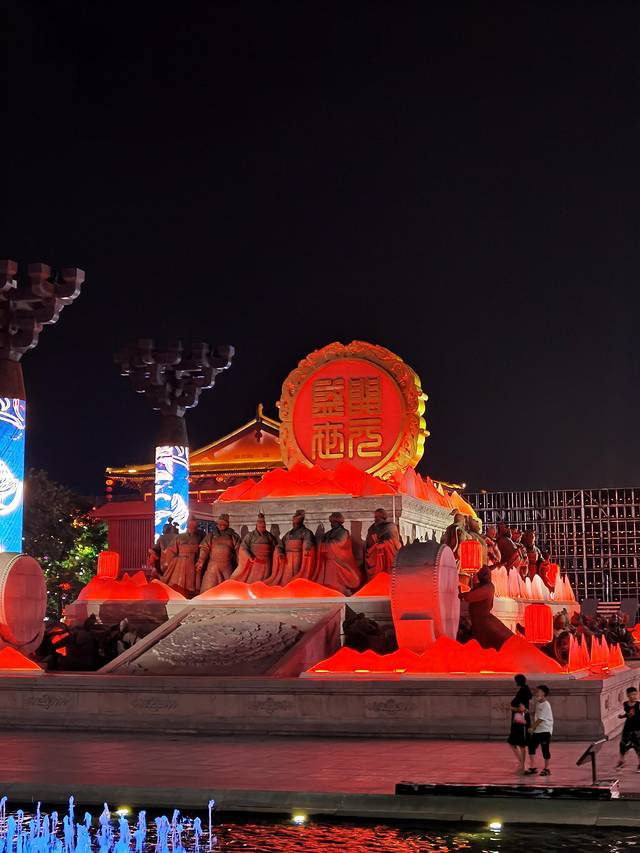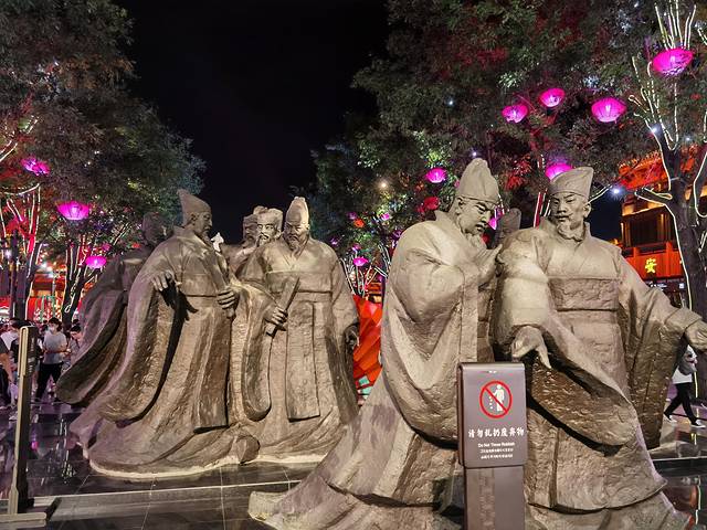 大唐不夜城也是一条步行街,以盛世大唐为背景打造,听说为了打造这个“不夜城”,政府花费了不少。来到大唐不夜城,的确令人眼前一亮,这里灯光璀璨,十分耀眼夺目,整条步行街融入了很多唐代的元素,有:穿着唐装的歌姬跳舞,正在打铁的石头人,打扮成武则天、诗仙李白等唐代名人的演员站在花车上巡游,偶尔还有一队穿着盔甲的唐兵在路上巡查,比较可惜的是由于来的时间对不上,没有看到最有名的 “不倒翁姐姐”,想看的朋友来之前务必在网上查一下演出的时间。