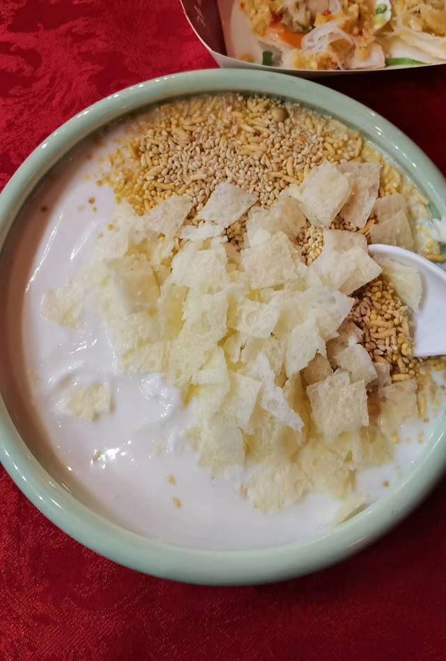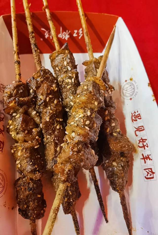 我们去到红柳枝的时候已经是晚上九点多了,还好这个时候不用排队。我们点了很多,每样都试一点。羊肉串是必点的,是这里的招牌,它是用红柳枝串着烧的,肉里面混有红柳枝的香味;还有羊奶做的酸奶,上面铺了芝麻和一些脆脆的也挺好吃。总之大家来银川的话一定要来红柳枝试试。