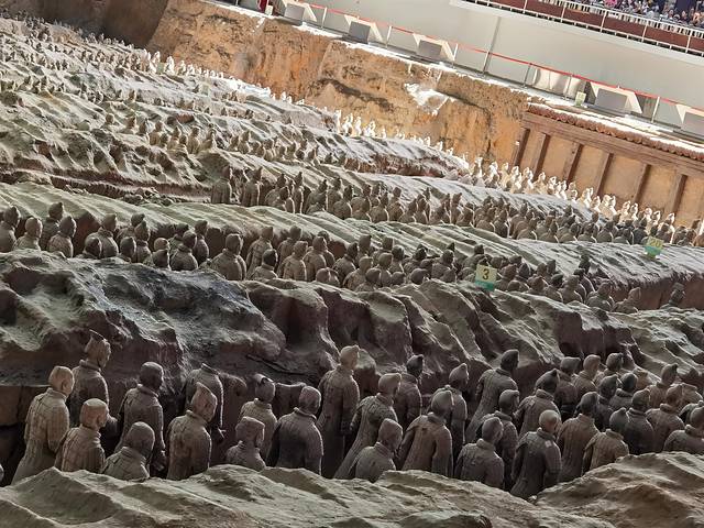然后就是参观兵马俑一号坑、二号坑和三号坑,但其实只有一号坑有些看头。一号坑很大,有一个正规足球场那么大,也是最早开发出来的,里面整齐地摆放了数百个兵俑。每个泥塑雕像的样子都不一样,据说每个都是按照不同的真人的样子造出来的。
