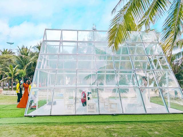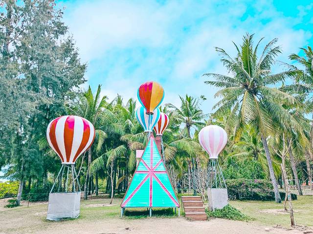 椰梦长廊其中有一段更是浪漫到冒泡。这一段有一个婚纱摄影基地,沙滩边设置了各种拍照道具,鸟巢、仙人掌、小花园、直升机、粉色风车、白色教堂、复古蓝色巴士……再加上椰林、沙滩的点缀,随手一拍就能收获超多小清新美照。来这里拍婚纱照的新人一波又一波,看得我都想拍婚纱照了,哈哈~在椰梦长廊我们还见证了一对新人的婚礼。碧海蓝天为席,山川湖海作证,浪漫得不像话。