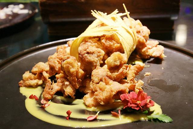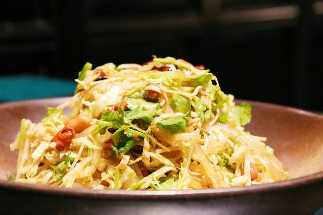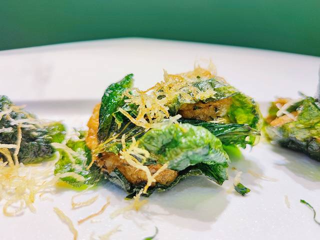 捞叶虾饼。任何跟虾有关的菜品我都很可,这道菜被我自己吃光了,因为实在是太好吃了~虾饼是被裹在紫苏里炸的,外焦里嫩,一点也不油腻。再蘸上甜辣味儿的蘸酱,完美!