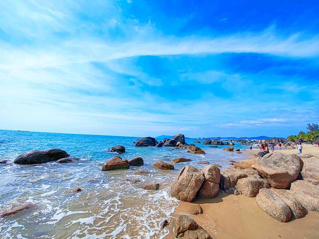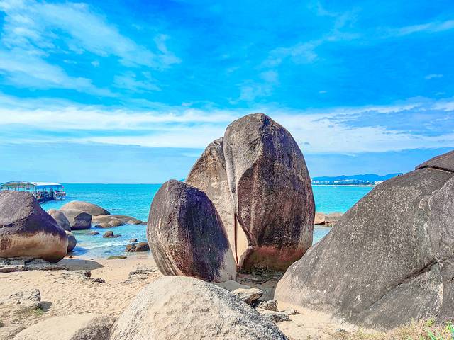 其中最负盛名的是天涯石和海角石。天涯石是景区的标志和象征,几乎每一个到天涯海角的游客都会跟它合个影。清代崖州知州程哲在石头上刻下的“天涯”二字清晰可见,下方还有“海阔天空”四个隶书大字。它稳稳地坐落在沙滩上已有亿万年之久,可以说是真正地诠释了什么叫“坚如磐石”。
