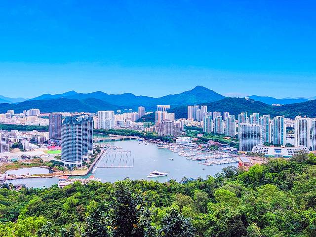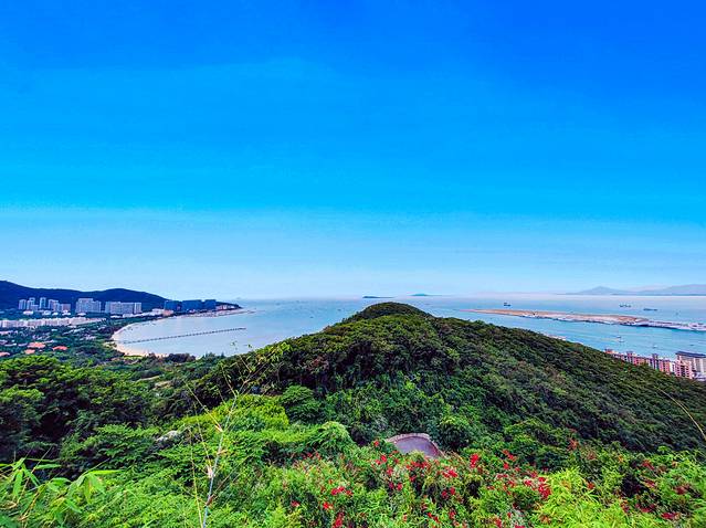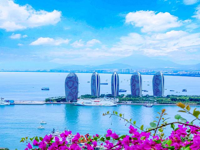 观光车终点附近是凤凰岛眺望台。极目远眺,起伏有致的山峦、一望无际的大海、鳞次栉比的建筑、往来穿梭的船只、热烈奔放的三角梅依次映入眼帘,整个三亚市区的美景一览无余,俨然一幅层次分明的秀美画卷。