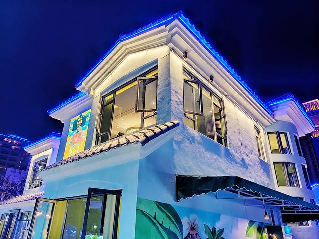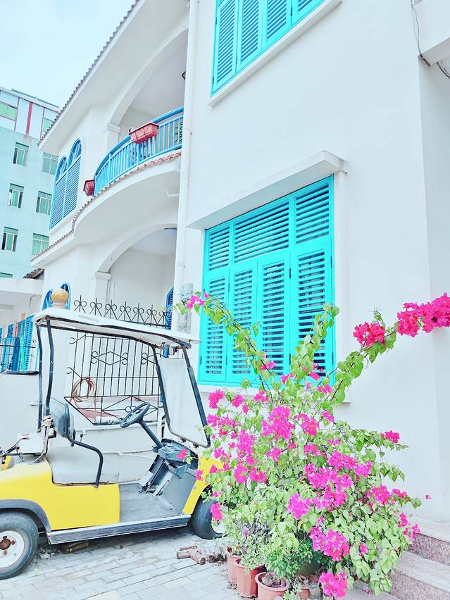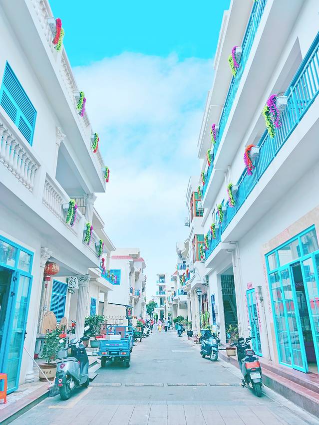 一路上我满怀期待。之前在朋友圈看到三亚“天涯镇”的时候,一瞬间就被种草了。小镇房屋为蓝白色调,蓝色门窗白色墙壁,墙壁上还有很多可可爱爱的海洋元素的涂鸦,梦幻得像是宫崎骏电影里的场景。干净整洁的街道边随意停放着各式电动车,房前屋后的鲜花和绿植是小镇居民热爱生活的写照。是我喜欢的样子啊~