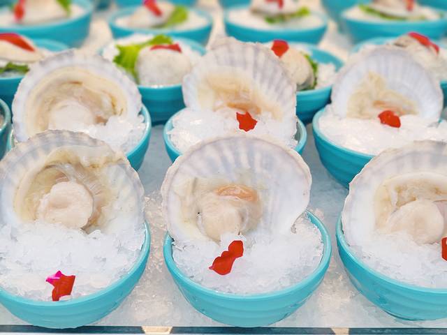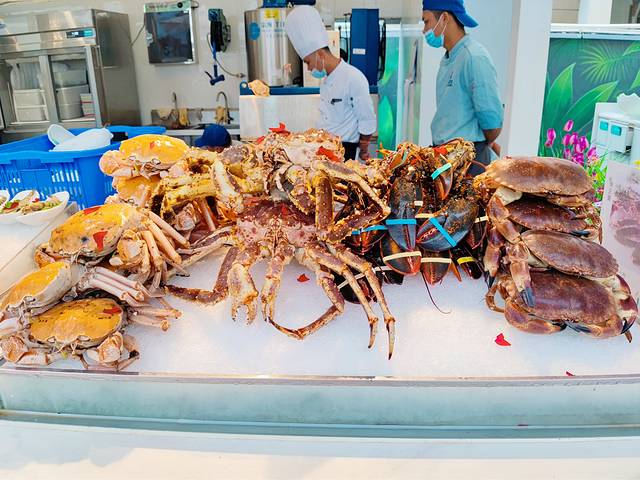 大悦洋雨林餐厅的菜品之丰盛是超乎了我的想象的。帝王蟹、波士顿龙虾、罗氏虾、白牡丹虾刺身、鲜活北极贝……各种品类的海鲜应有尽有。