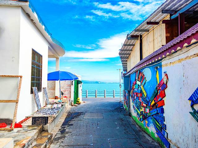 不知过了多久,天居然放晴了!我们立刻从海边折回小镇。果然天气是最好的滤镜,蓝天白云的点缀下,小镇的颜值立刻就up up up!有种圣托里尼的感觉。小镇共有黄龙街、黑龙街、青龙街、白龙街、红龙街五条街道,每条街道都直通大海。在街巷中穿行,每一个转角和每个不经意的回眸,都能遇见不一样的风景。
