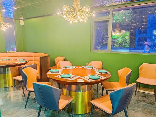 锵锵蟹坐落在海角院子里,绿意森森,流水潺潺,这个小院我可真的太喜欢了。餐厅外观是清新的tiffany蓝,内部墨绿色墙壁和粉白桌椅的搭配很出彩。室内室外的就餐环境都很棒,可以根据自己的喜好选择心仪的座位。