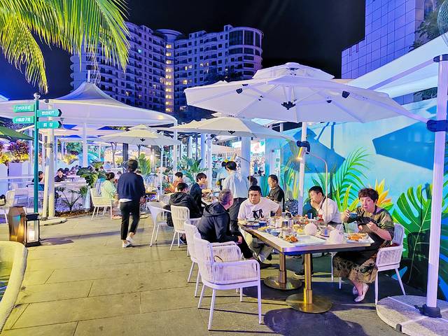 店如其名,大悦洋雨林餐厅真的就像是一个雨林世界。在椰树、绿植、雾森、流水以及灯光的营造下,呈现出一种如梦似幻的氛围。就餐区域大都在室外,吹着海风吃着海鲜,气氛非常好。