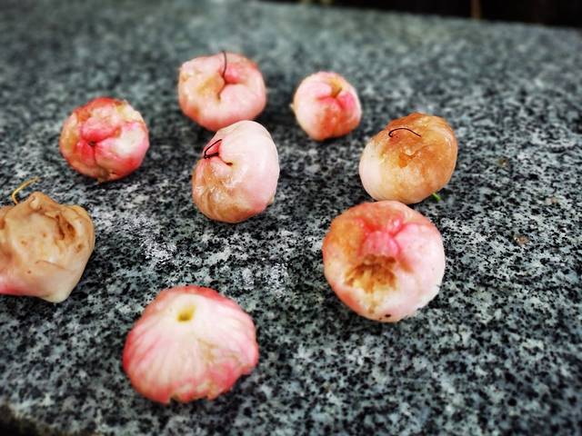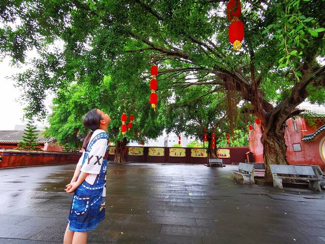 看介绍文昌孔庙为中国唯一一座不朝南开大门的孔庙。据说老文昌人曾经立誓,“状元不出,龙门不开”,文昌虽然人才辈出,却没有状元,孔庙就至今没有大门,只有一左一右两个侧门。由东门(礼门)而进,一进门一颗硕大的莲雾树,果子落了一地,第一次见到这种东西,参观的当地人说可以吃,取了几个尝了尝,果然甜甜的好吃。突然在树下发现了一个一尺多长的蜥蜴,不太怕人,逗了逗顺着树爬上不见了踪影。过了棂星门、状元桥,突然下起了一阵急雨,雨过后来到大殿,女儿给圣人上了柱香,后院的参天大榕树……