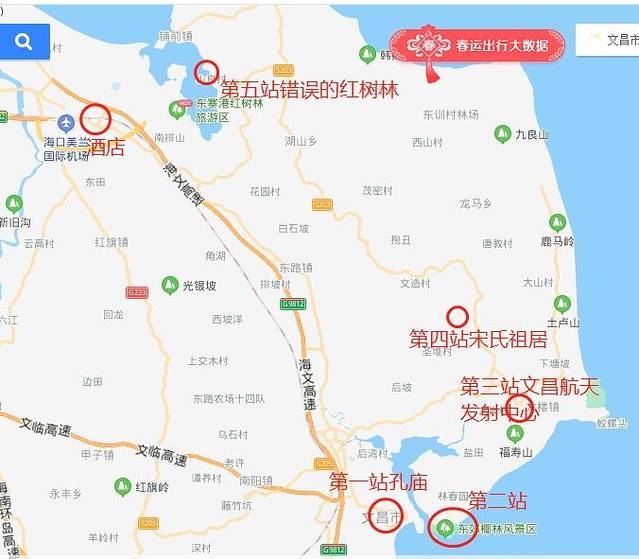 当天游:文昌孔庙、东郊椰林风景区、文昌航天发射基地(打卡)、宋氏祖居、红树林风景区(因导航位置错误,导致失败);