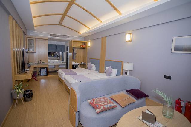 这家民宿以疍家文化为主题,挖掘疍家故事,彰显疍家文化。民宿有8间客房都是用船打造的船屋,渔船造型,住在里面就像住在船里的感觉,舒适,听着海风,真的很真实。