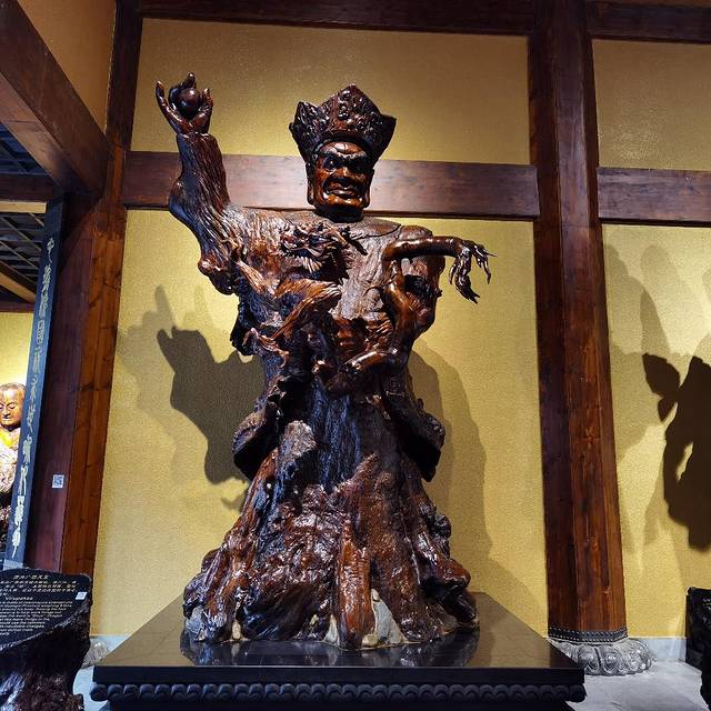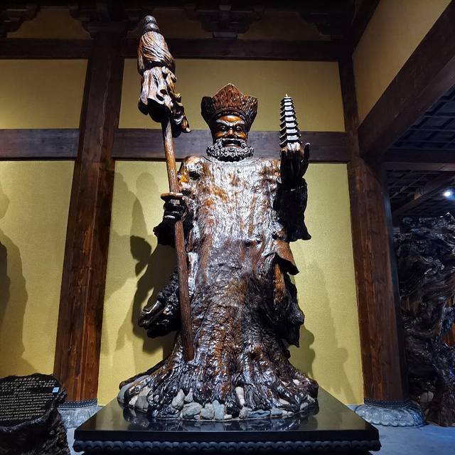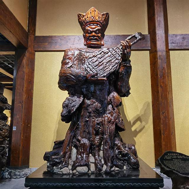 这里的房屋建筑外形与唐朝时期的建筑外形相仿,身处其中仿佛我又梦回了传说中的盛唐,与千年前的文明进行了无声的对话。我走进了第一间屋室,迎面而来的是一尊叫“未来佛”的巨型根雕,惟妙惟肖的面容身姿让人连连称赞。我越看它的神情就越沉浸于此,仿佛眼前的这尊佛像是一位真人躺在你的眼前,在潇洒的吹风颂经。其后周遭四角也摆放着四尊雕像,我当时便想是不是四大天王,看到雕像前排的名片后,果然我的猜想得到了验证。不同的天王有不同的脾气喜好,这使得十分考验雕刻者的雕刻技巧,而在此似乎一切都随雕刻者的得心应手而变得容易,他们的巧手使四位天王的个性展露无遗。