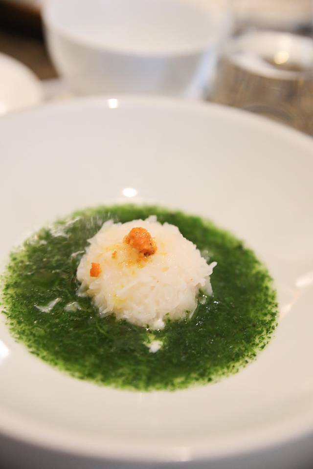 【翡翠虾球】荠菜和黑松露汤汁打底,虾球外裹了一层银耳,真是下了功夫。