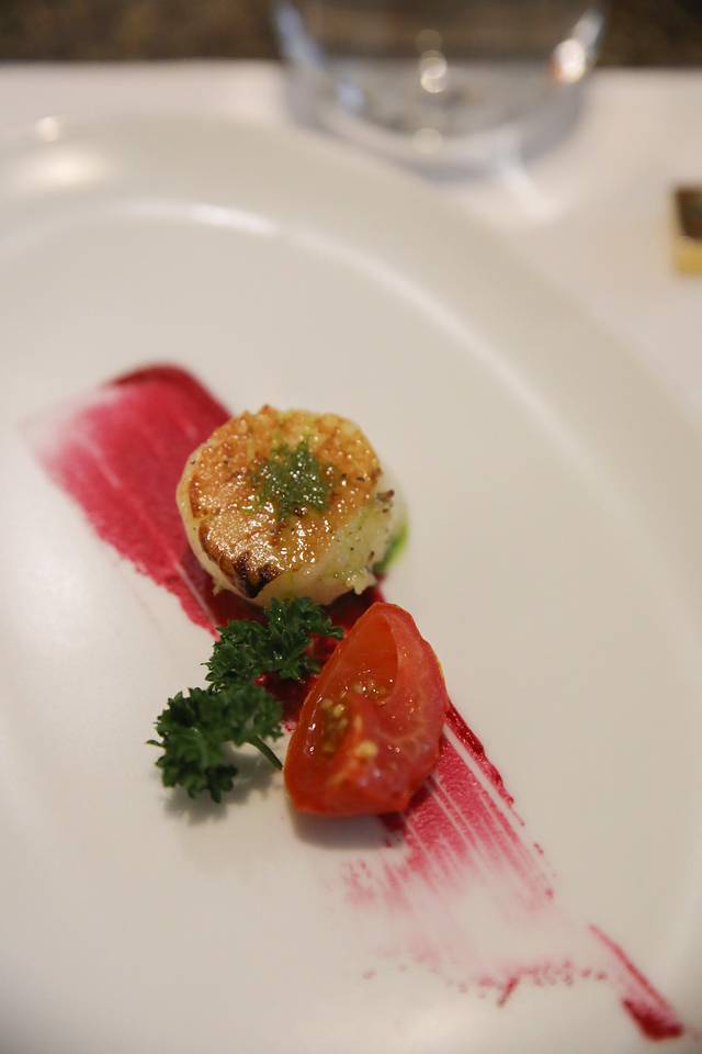 【南宋低温慢煮江瑶生】澳洲带子搭配香草汁,口感扎实却不硬,一口鲜美满足。