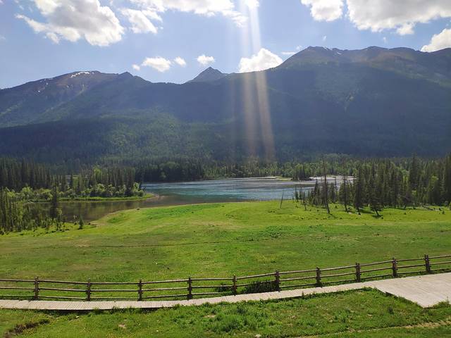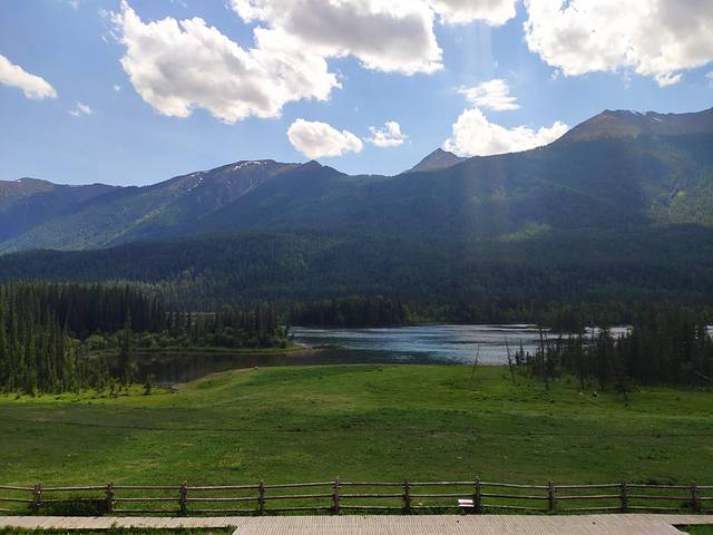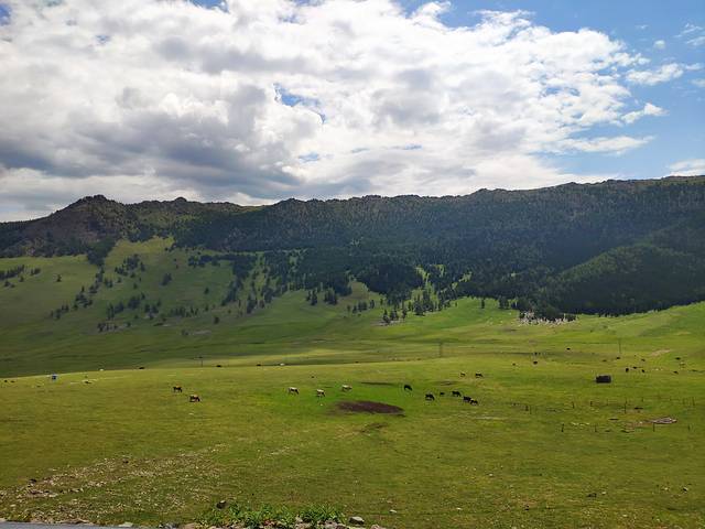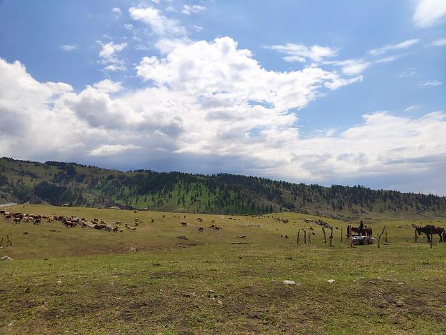 终于到了喀纳斯!从进入阿勒泰地区开始,路绕山时而上,时而下,风景不停变化,逐渐的草原开始出现,满眼绿色成群的牛马悠闲的吃草。来了来了,她来了!