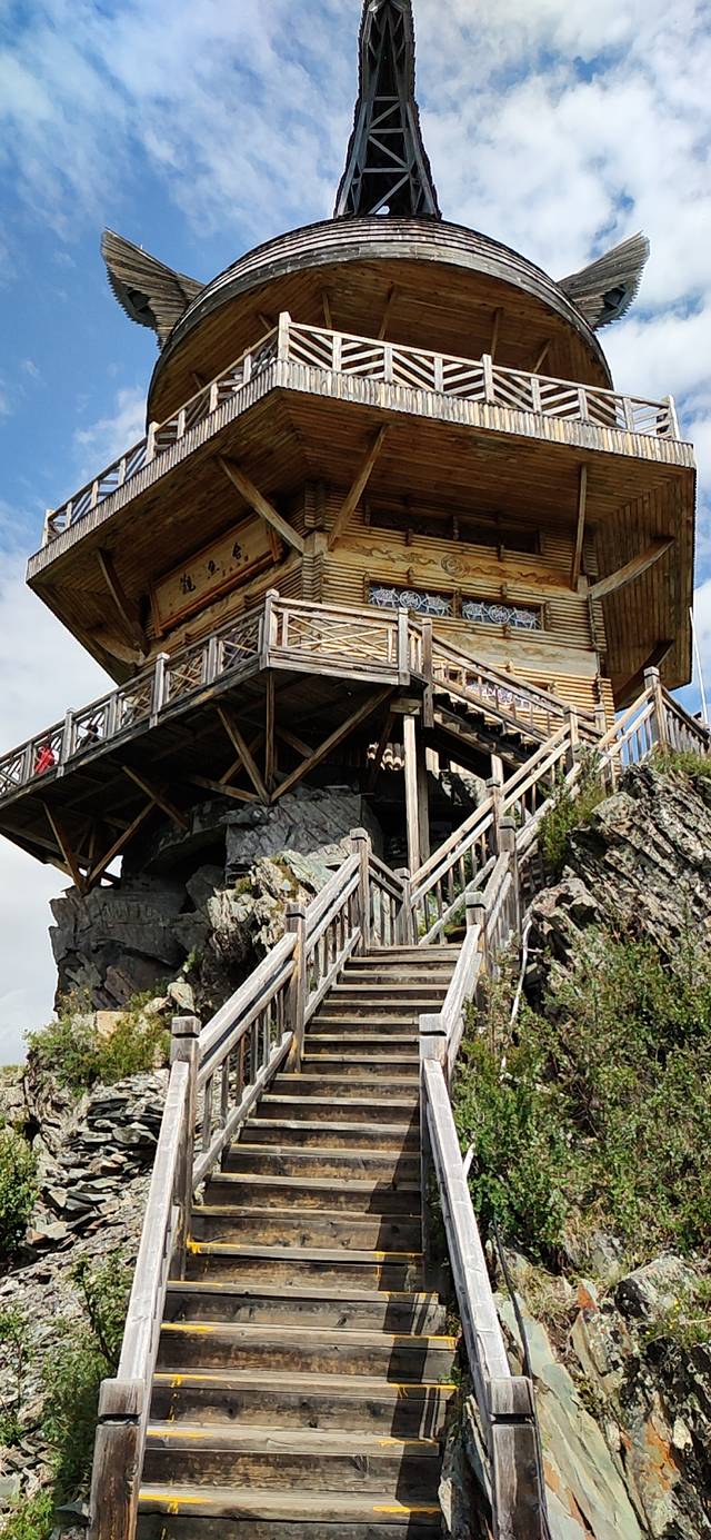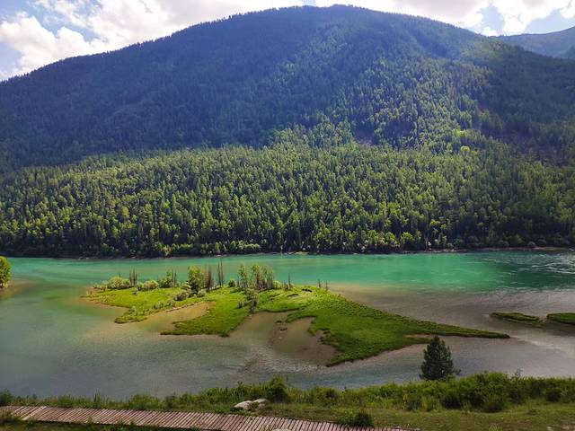 今日才是喀纳斯的重头戏。小木屋那里可以等公交/大巴车,几分钟就有一班。第一站我们去观鱼台,需要拾阶而上,登高远眺喀纳斯湖,果然高处美景更甚。