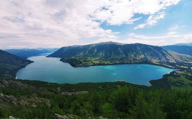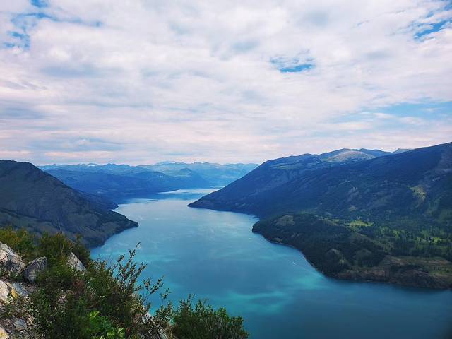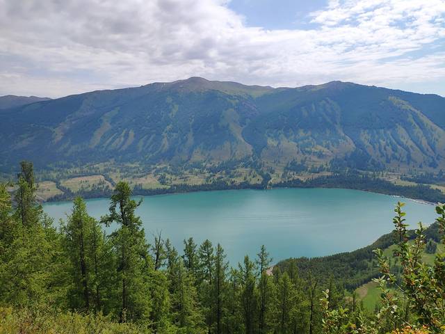 然后乘车回到小屋退房,乘景区车至喀纳斯游客中心吃过中饭,带着行李箱乘出景区方向的大巴,一站一停去看大名鼎鼎的三道弯,如果下来玩的久,行李要随身带着不方便。我们乘坐的那班车每到一个景点会停下来,给我们时间下去欣赏,行李就放在车上。因为喀纳斯面积巨大,走路是根本不可能的,景点之间必须乘坐景区大巴车。三道弯的水是静谧的蓝色,像极了神话里该有的样子。我们来的夏季,没有层林浸染的颜色层次,大概秋天的喀纳斯会更美吧。