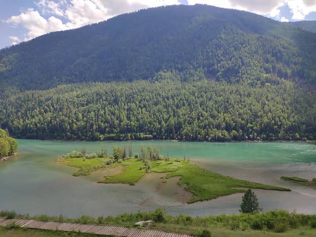 然后是卧龙湾,非常形象。一只萌萌的小恐龙猫着身子走在湖中。这个弯是可以沿着树荫里栈道一直下到湖边的,可以捧一掬清水,感受下新疆的清凉。