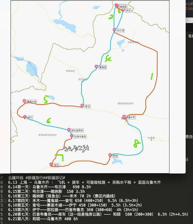 这条线尽可能多的去到各个经典景点,尽可能的让旅行物超所值。但是为了去最北端的喀纳斯,需要有两天几乎全部是车程在路上。为了喀纳斯和禾木村最终我们选了这个大环线。