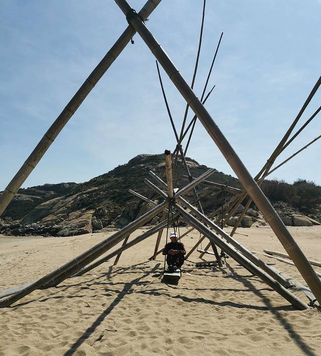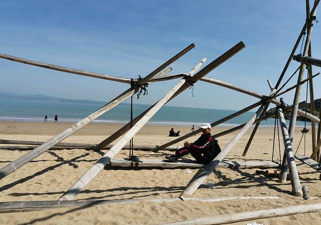沙滩上用粗麻竹架起的长吊板,可供七八个人同时荡秋千,如今严重倾斜,楼主还能坐着荡躺着荡