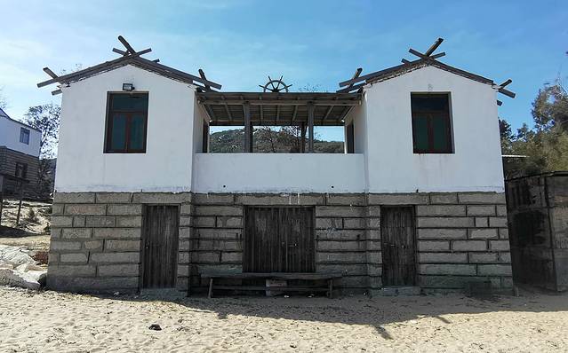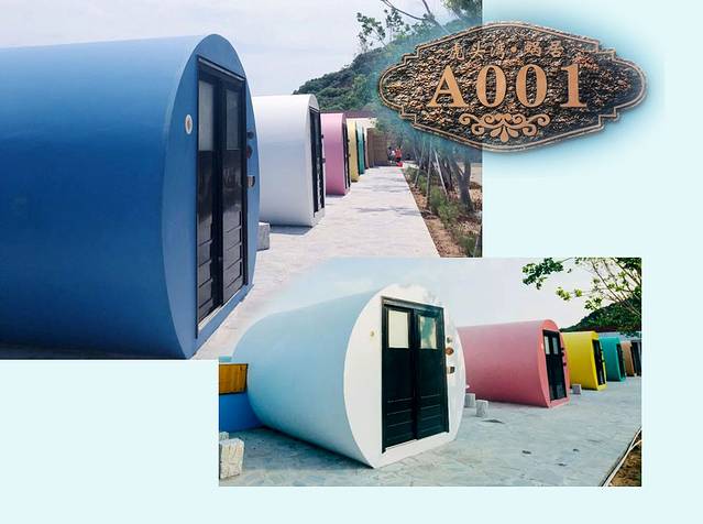 海浴池旁的七彩圆形海景房,标识为“虎头湾· 蜗居”,沿海岸线而建,尽揽海边美景。现在不知何缘移离原址暂时摆放他处