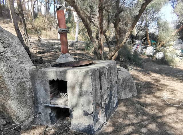 林中,挨着岩石砌着大型柴火灶,炉中还有草木灰,看来曾有游客使用过