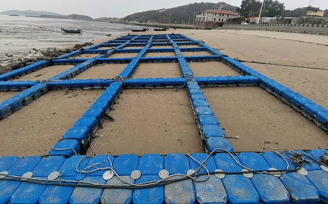 潮涨潮落有着不同的意境,这是网箱养殖的鱼排拉到岸边浅水区整修(同一个渔排在不同的时间段拍摄的)