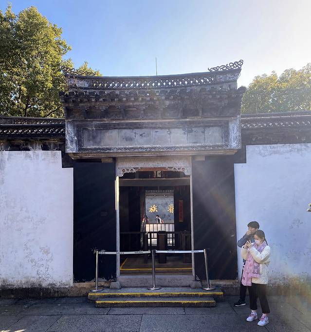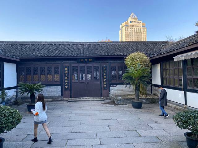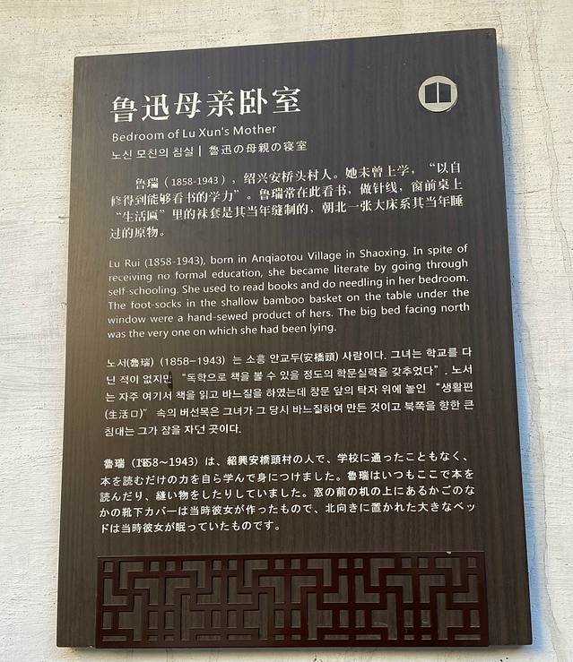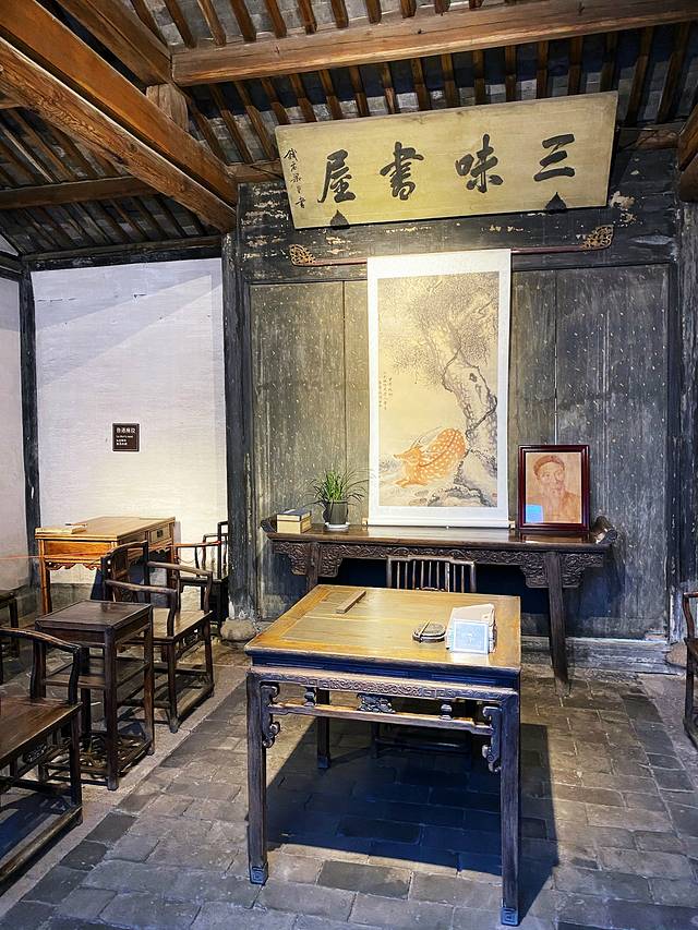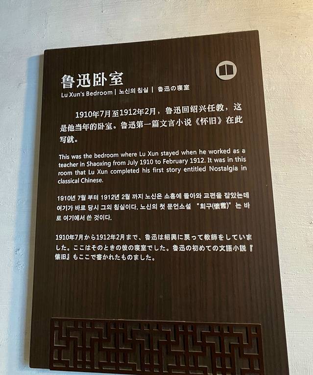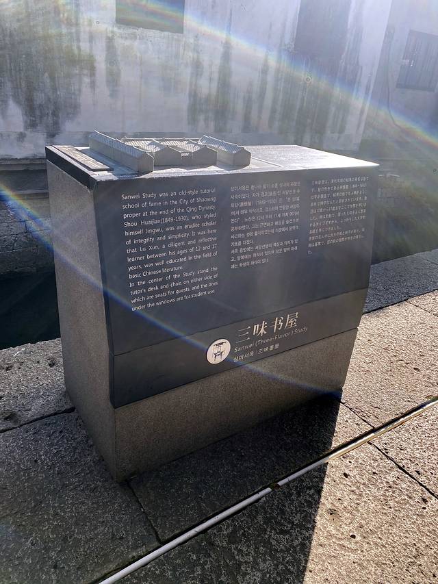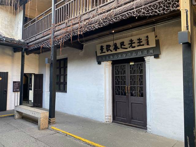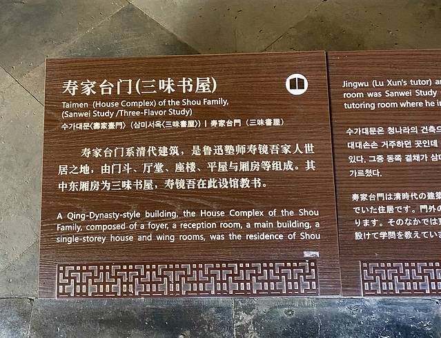 三味书屋,清代建筑,在鲁迅故居东约70米处,本是寿氏书房,后改为私塾,鲁迅12岁至17岁时在此入塾。书屋是寿家台门东花厅,坐东朝西,三开间平屋。屋后有小园一,植有腊梅、桂花及天竹等,为鲁迅与同学课余嬉戏之处