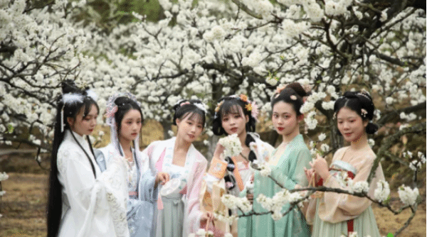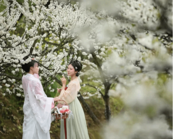 身着汉服的小姐姐比这如雪的李花还要亮眼。
