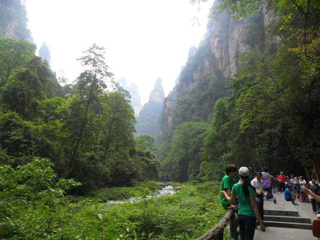 接着我们走到贺龙公园,匆匆转了一圈已到中午,在山顶一个小餐馆用完中餐。然后,我们便坐索道下山,去了十里画廊。有许多人坐小火车观赏十里画廊,我们是徒步的。道路很窄,左边的河中已没有流水,据说是一次洪灾把源头的阴河冲改道,从此只有下大雨十里画廊才会有水。但两边山峰耸立,特别是“采药老人”、“三姐妹”什么的,很是形象。游完十里画廊,我们在张家界景区的行程也宣告结束了,觉得有些意犹未尽。
