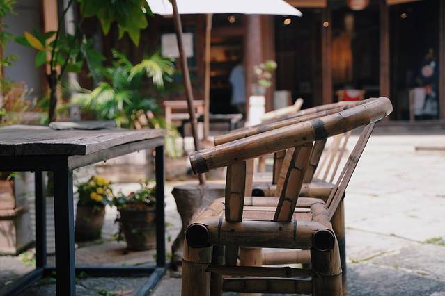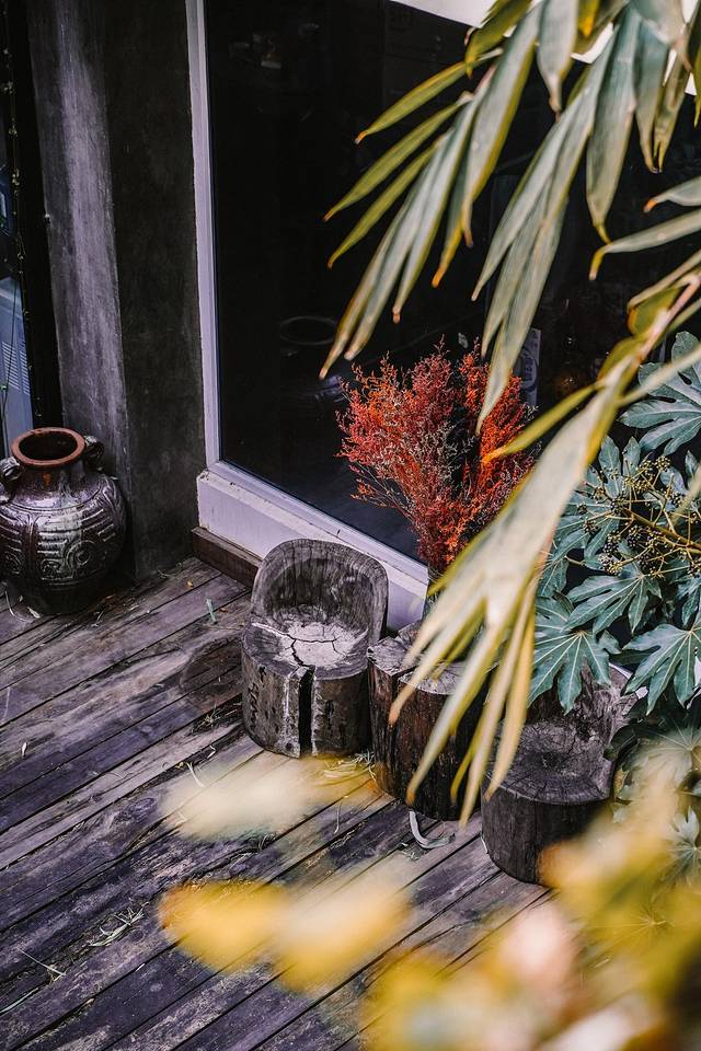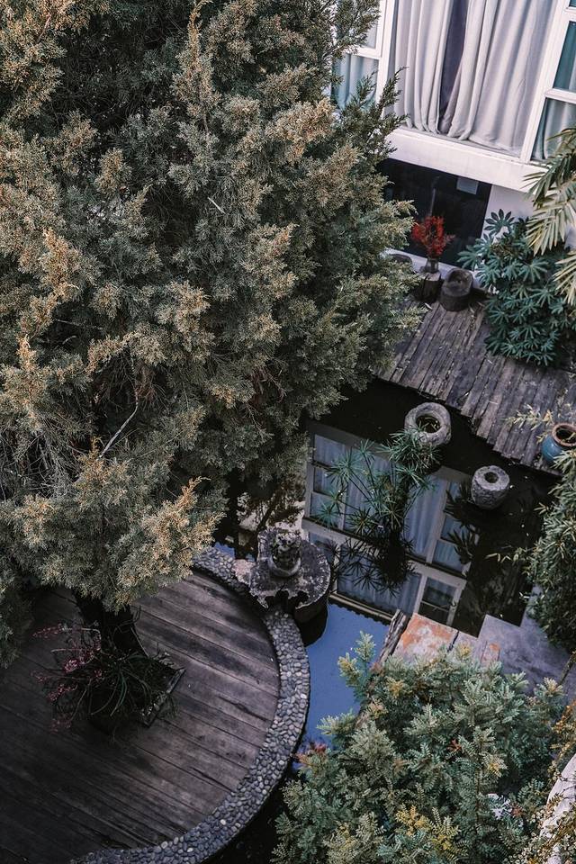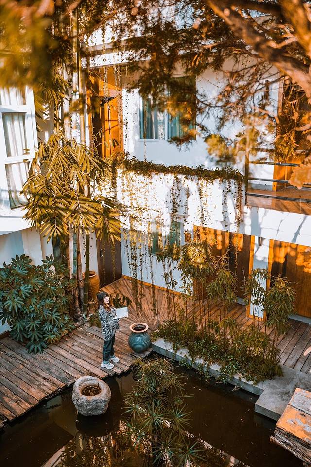 院子里满是绿植,还有小鱼池,心灵和眼睛都很适合休息。很多地方都适合拍照,老板也有一柜子的书,可以借来阅读。阳光下,晒晒太阳,静下心来喝喝茶看看书,生活惬意。