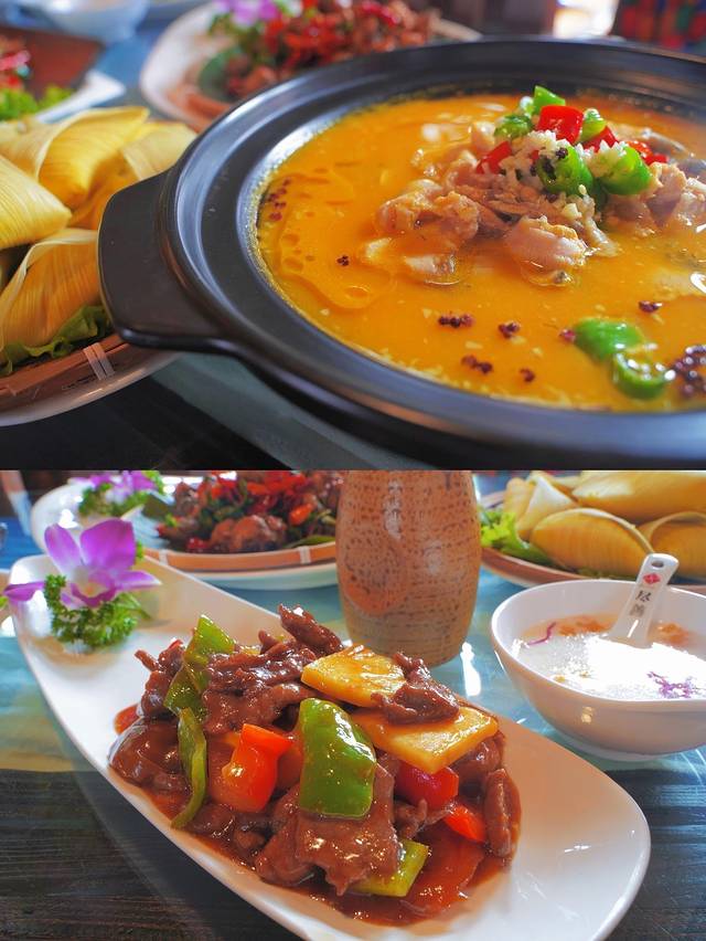 还有阿妹包浆豆腐,油炸过后的豆腐外皮酥脆,内里嫩滑再淋上一层秘制酱汁特别入味!景颇族菠萝炒鸡,脆嫩的鸡肉和菠萝相遇酸酸甜甜,又带一点微辣是一种很新奇的味觉体验。玫瑰酿也不错,酒味不重,只有8度,入口绵甜有浓浓的玫瑰香气,很适合女孩子喝。