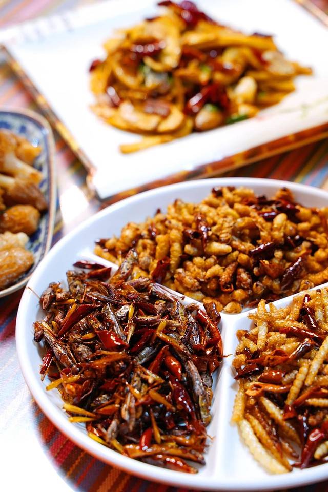 非常有当地特色的【云南三宝】:竹虫、蜂蛹和蚂蚱,敢吃的朋友可以试试~🥀玫瑰酸奶和风花雪液🍺也很推荐,清爽解腻~