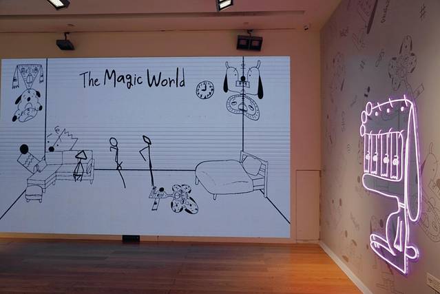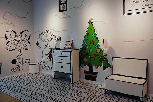这是加贺美健中国内地首展,惟妙惟肖的图案吸引了很多人前来观赏。里面有一整面的投影仪,效果非常不错呢!将趣味行径带入平常生活中,进入一段童话世界里。床和沙发在空中漂浮,房间里的小狗和人物也在熟睡,与LED屏幕互动,简直可以让静止的黑白图案活起来。