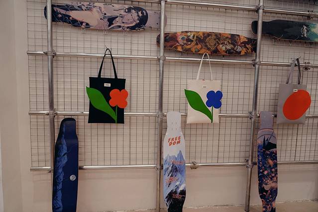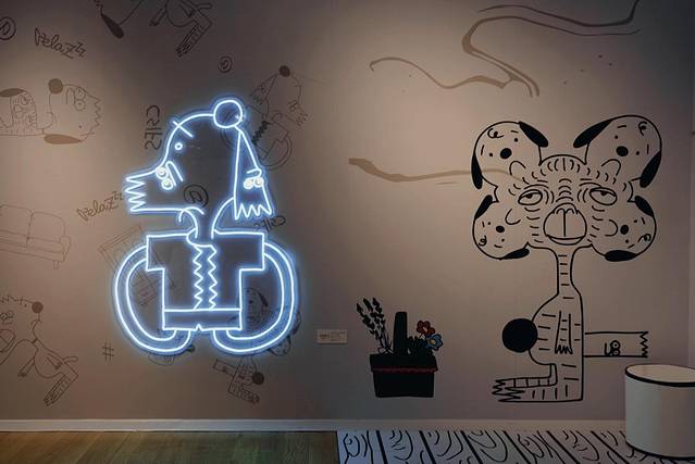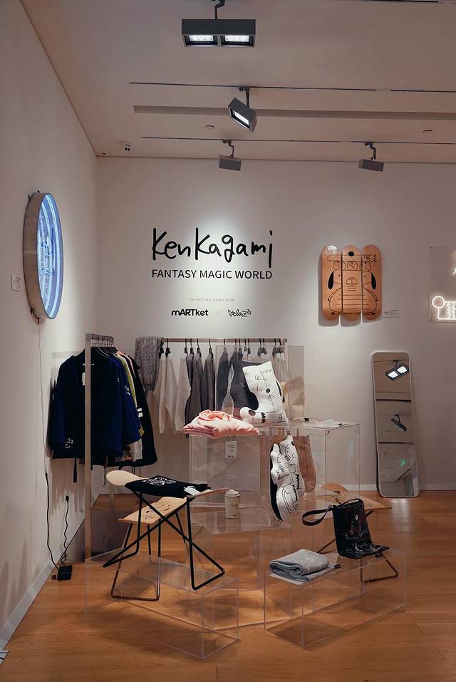 简洁的线条勾勒出了不一样的美感,里面还有一些衣服的售卖区,让人沉浸在非常惬意的艺术空间里。在手稿展示区里,也充满了这个艺术家的奇思妙想,充满想象力的线条,让人会心一笑。还有周边售卖区域的贴纸、铁艺画、咖啡杯、围巾等,都是倾心打造而成。