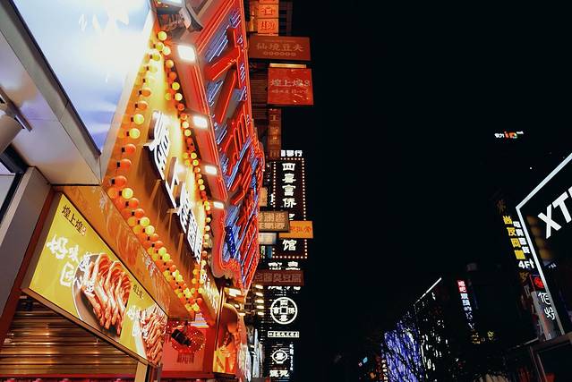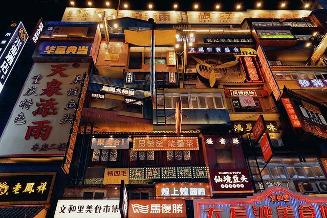 黄兴路步行街是长沙市最繁华的地段之一。步行街分为内街和外街,内街又有三层。商铺众多,品牌齐全。除各种常规服装店、饰品店以外,这里还汇集了全国各地的小吃美食。这一面墙上有长沙各种各样的店铺门头,晚上的灯光全部打开,实在是很有意思。