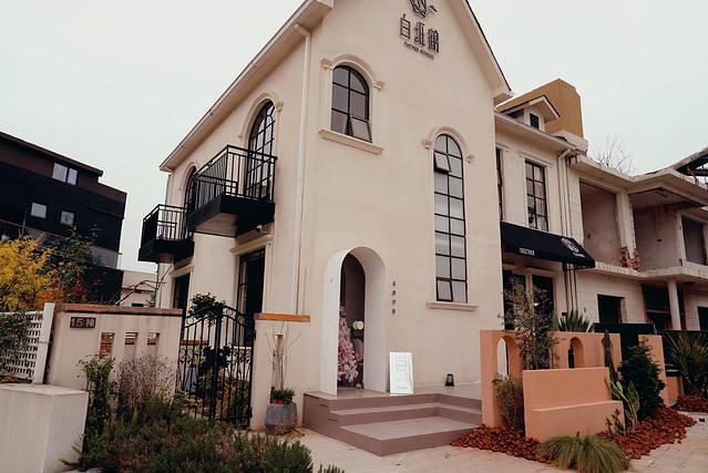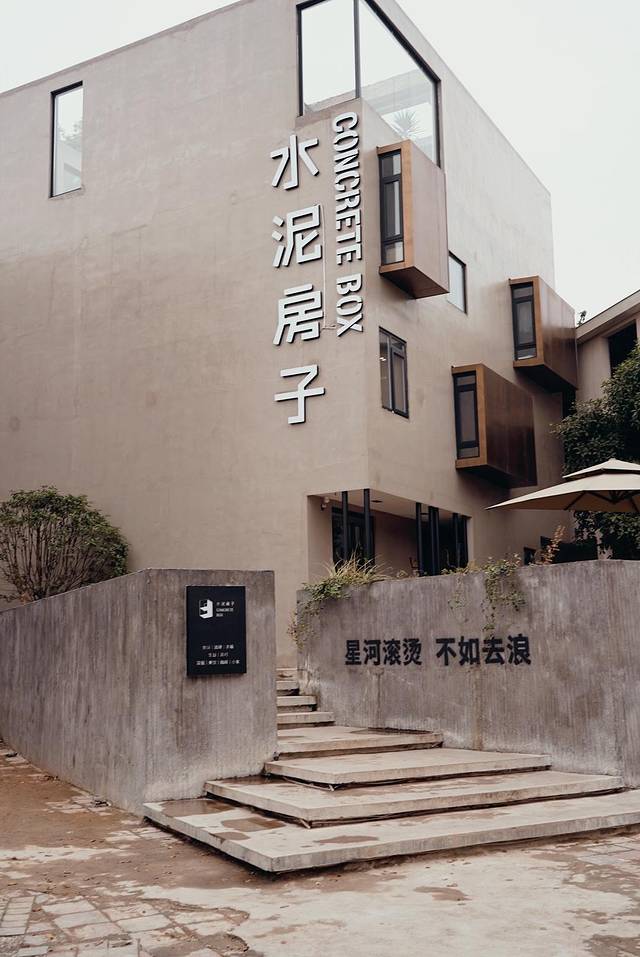 这座建筑的名字叫做水泥房子,外面写着星河滚烫,不如去浪。走进去一看,也是颇有风格的咖啡厅呢。线条分明的几何形状,灰白的极简配色,使得它不管是雨天还是晴天,都能与自然完美融合成一副美丽画卷。