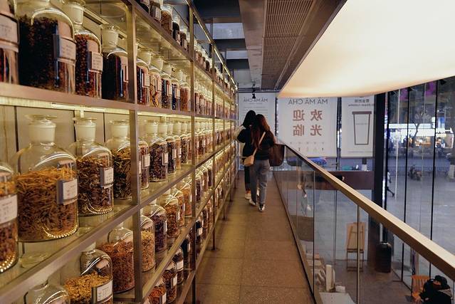 妈妈茶的店铺特别有设计感,一进门就是衰败的石头,顿时成为了很多人打卡的地方。环境宛如废墟里搭建起来的装修风格,工业风的感觉,加上二楼布满整个墙壁的草本植物的罐子,让人惊呼,也太适合拍照了吧!
