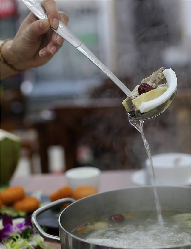 服务员先把大青椰子水倒进锅里,等椰子水烧开之后,再放进剁好的鸡肉,等到汤烧开之前,记得要先喝一碗清甜纯正的椰子汤。喝完椰子汤之后,最后再放入青菜。