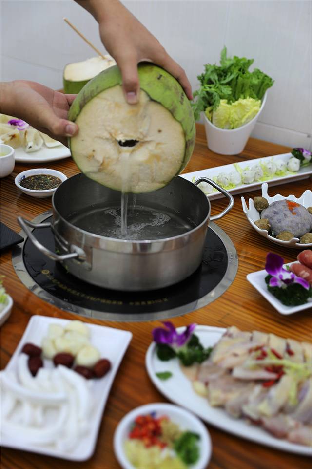 椰子鸡火锅的烹煮顺序是这样的: