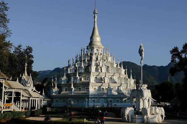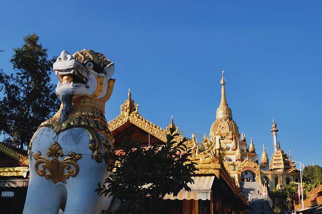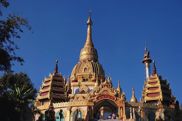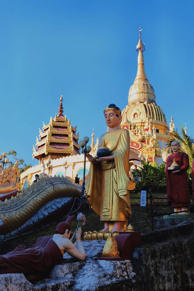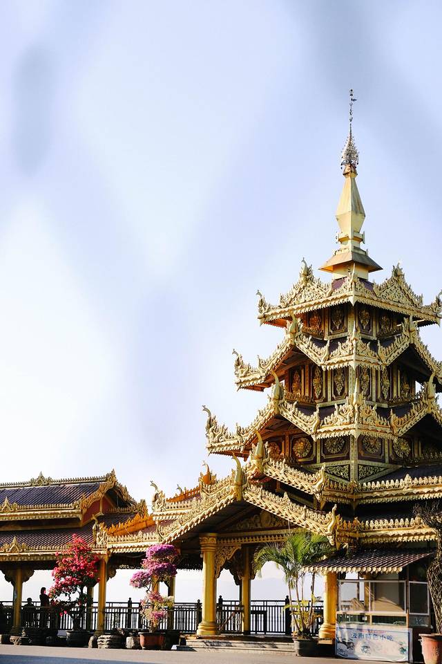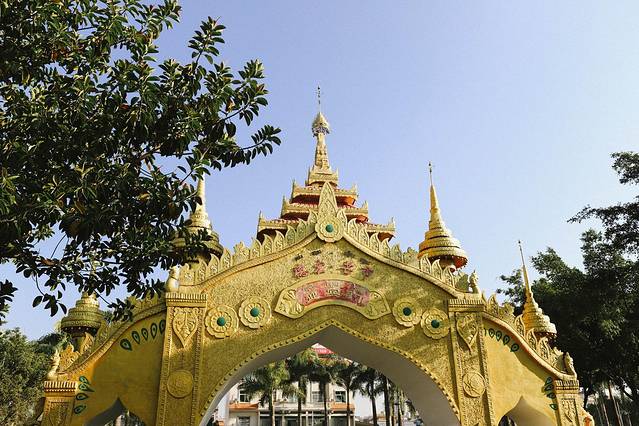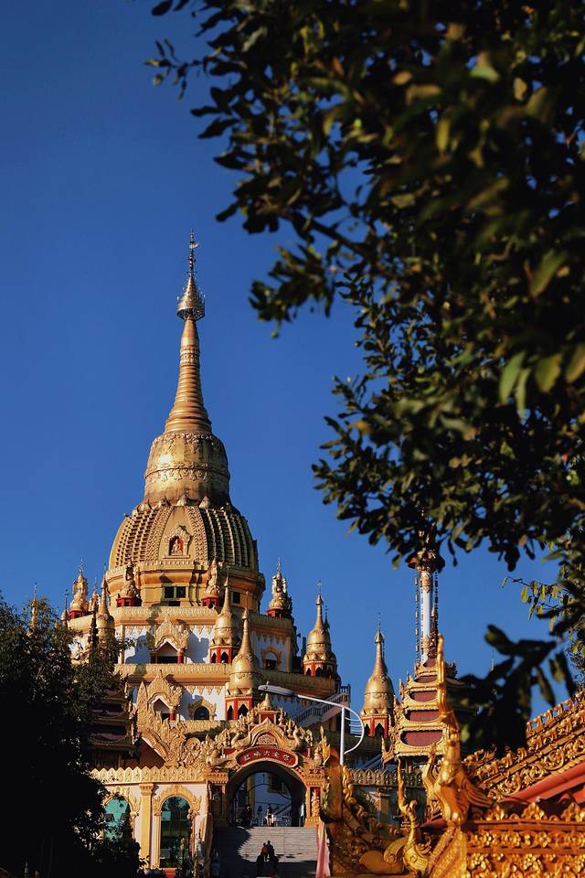 前面说过“勐焕”就是芒市的傣名,所以这里又称芒市金塔,位于芒市东南部孔雀湖畔的雷牙让山顶,在芒市的许多地方抬头都能看到这座塔,金光闪闪特别好看。