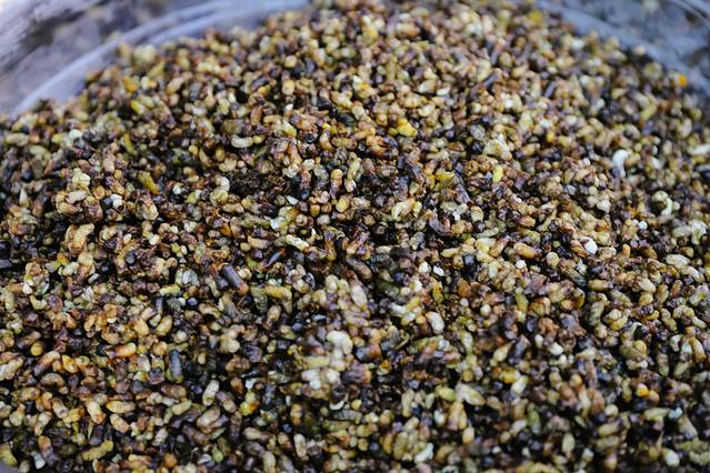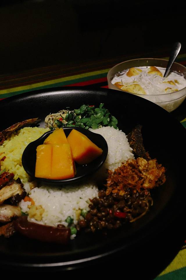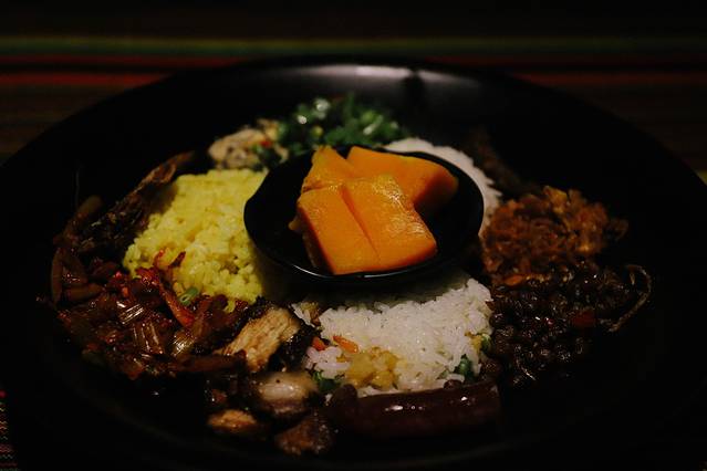 米饭外围有很多配菜,有香肠、腊肉、鸡肉、小鱼干、豆子、芹菜、折耳根等等...