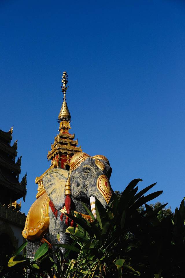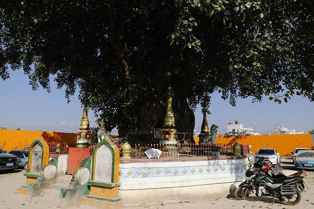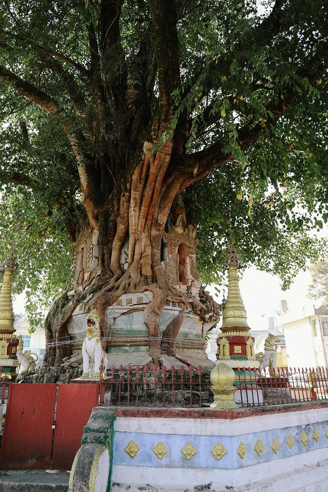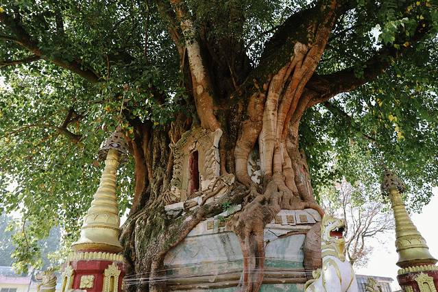 这座傣式佛塔是200多年前芒市土司为了纪念一场战争的胜利而建,之后一粒榕树种子偶然落到了这里,佛塔就渐渐被榕树包了起来。