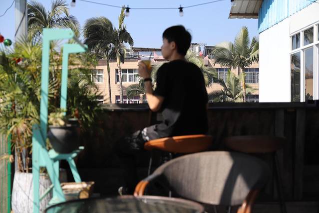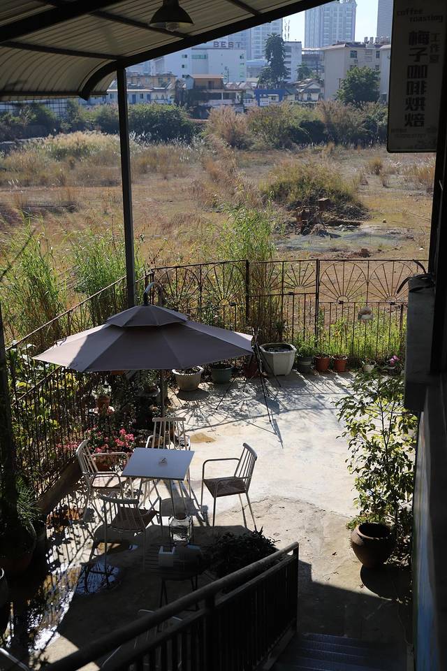 梅子咖啡建在一座废墟楼里面,有三层,空间特别大,室内室外都有座位,阳光很充足。