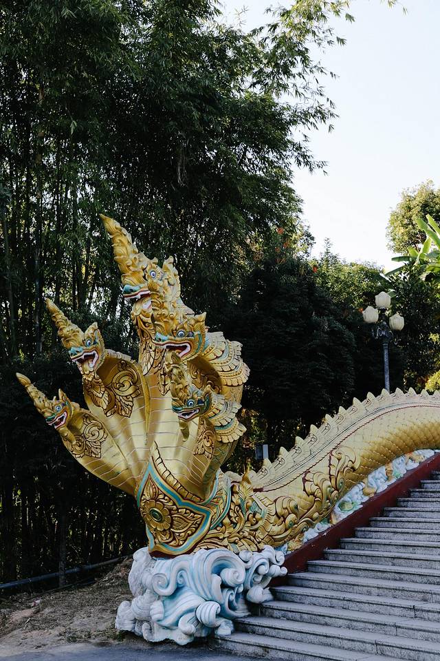 走进金塔还要攀爬一小段台阶,台阶两旁遍布各种佛教雕塑,有五头神龙,大象、还有一排僧人。
