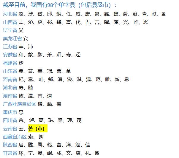 ps. 中国单字县不在少数,比如沙县,沛县…(我一开始以为没几个,后面上网一搜竟然有98个,表格贴上,一起涨知识)