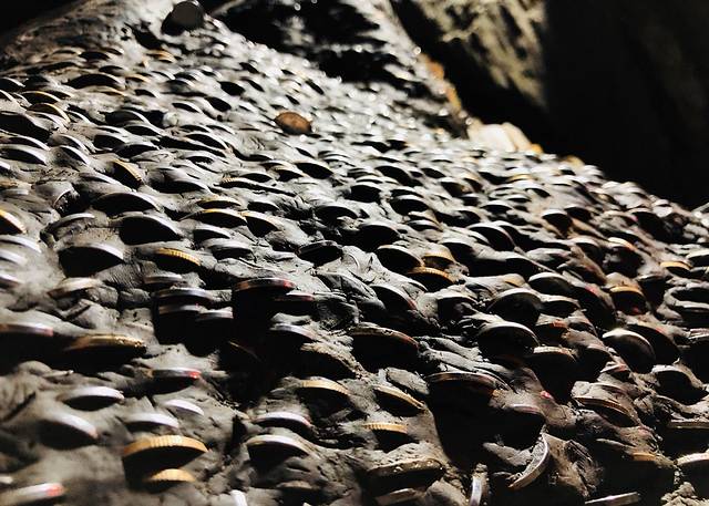 沉醉在一个人的溶洞里,突然被水里金灿灿的硬币拉回了现实,丢下第一枚硬币的人,可能不知道日后在这里会积聚了这么多的硬币吧