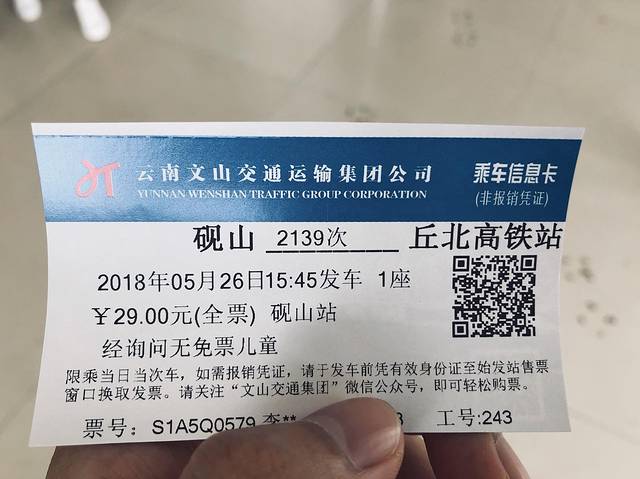 大约10分钟抵达砚山汽车站,去卖票窗口询问前往丘北高铁站的车(29元),一般售票员会告诉你这是过路车,要等,那就在一边等等,每十分钟去问一下,直到可以买票(不会等太久);