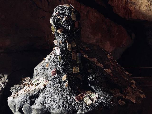 在火把洞里还看到了个很有趣的雕塑,不知是龟还是鼋,不是有趣在他的身上贴满了纸币,而是有趣在,它的身体里插满了硬币