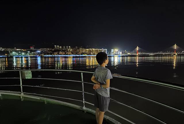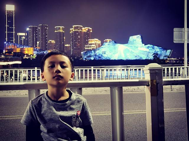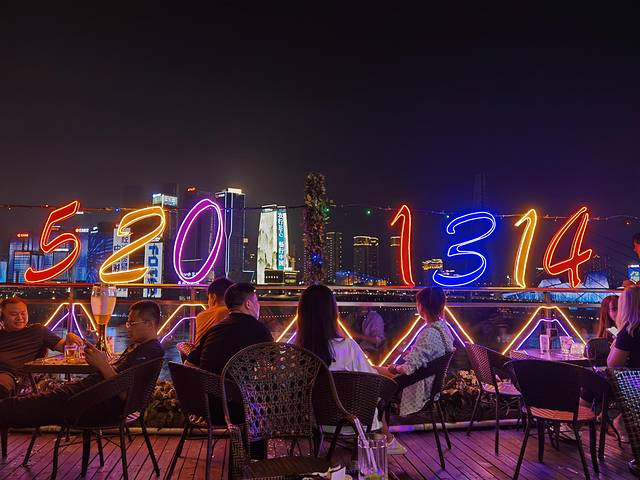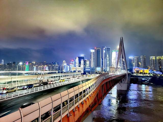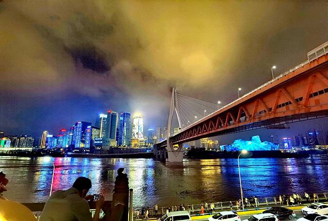 我们沿着江边走了一段路便绕到上面的千厮门大桥,在桥上看对岸的风景也很美,很多路人驻足拍照。我们继续走,经过洪崖洞的标志建筑,在这里玩了一会儿才离开。后来走累了,我们找了一个露天酒吧坐下。第一次带儿子泡吧,两个人来了一杯鸡尾酒和一些小吃,听着歌看着重庆的夜景,乐得逍遥一番。